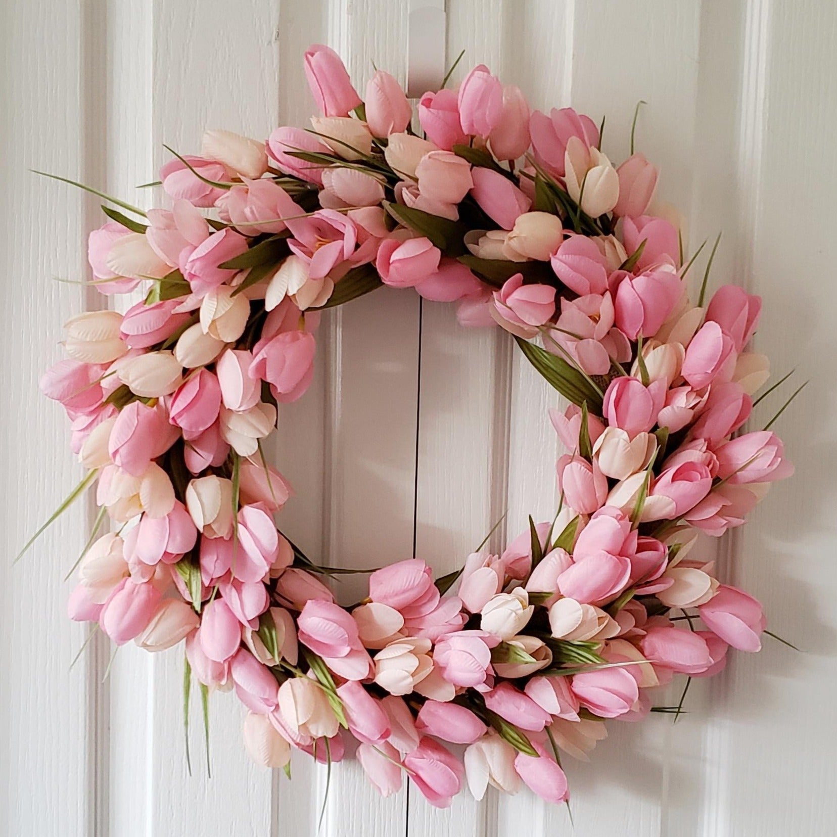Fill your home with beautiful flowers and colors with our Pink Tulip Wreath. This wreath features bright pink tulips and subtle green foliage. The wireform base is wrapped in burlap to protect your walls and doors and showcase the flowers in your décor.