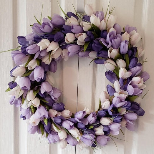 Nothing says "Welcome!" like this 14 wreath. A generous collection of flowers and greenery adorn a burlap-wrapped wireform frame to create a cheery look for your front door, entryway, or wall décor. The vibrant shades of purple tulips with a touch of greenery will make your home feel like springtime all year long.